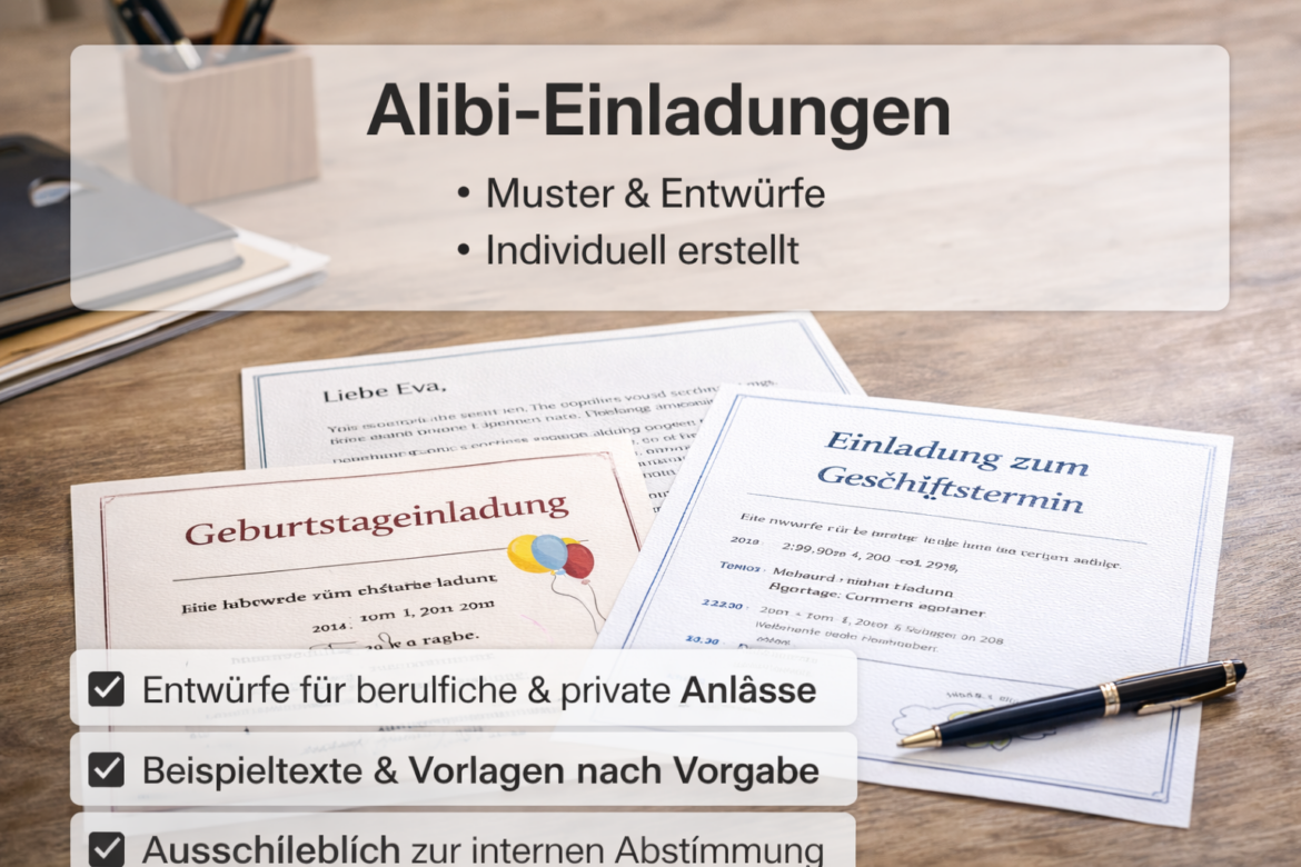 Wir erstellen Einladungen zu Geschäftsterminen oder Geburtstagen als Textentwürfe und Beispielvorlagen, die zur Ansicht, Planung oder privaten Darstellung dienen. Ziel ist es, einen realistischen Aufbau, eine passende Tonalität und eine stimmige Struktur darzustellen – abgestimmt auf den jeweiligen Anlass.