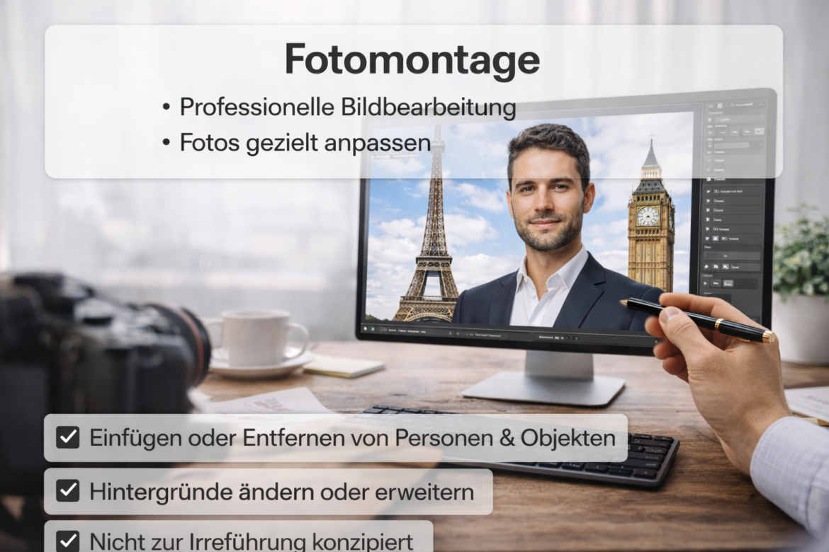 Unsere Dienstleistung Fotomontage bietet die Erstellung von visuellen Entwürfen, Beispielbildern und illustrativen Darstellungen. Ziel ist es, Situationen, Ideen oder Szenarien anschaulich darzustellen, nicht reale Ereignisse zu belegen oder zu ersetzen.